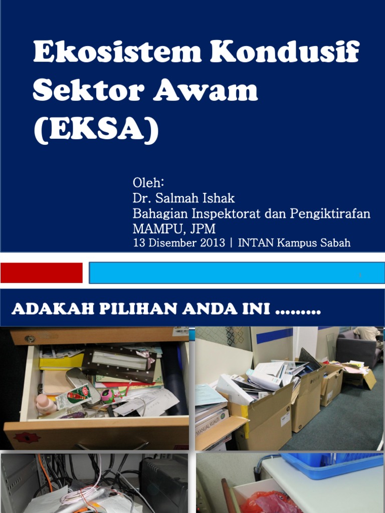 Sudut ekosistem kondusif sektor awameksa, zon mahkamah syariah teluk intan. Jan 2014 tot eksa mac/april 2014 surat pekeliling. Ia telah diperkenalkan mulai januari 2014 sebagai inisiatif penjenamaan semula amalan 5s sektor awam dengan mengambil kira keperluan bagi mengetengahkan persekitaran tempat kerja yang berkualiti. Salmah ishak bahagian inspektorat dan pengiktirafan mampu, jpm 13 disember 2013 | intan kampus sabah 1. Ekosistem kondusif sektor awam (eksa).