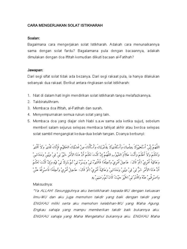 Cara Solat Istikharah Doa Lengkap Yang Korang Boleh Amal Untuk Cari Jodoh Remaja from www.remaja.my Tata cara shalat istikharah memohon kepada allah swt agar dipilihkan salah satu yang terbaik dari dua atau beberapa pilihan yang meragukan. Sholat istkharah dilaksanakan dengan dua rakaat. Sholat istikharah dilakukan secara khidmat dan khusyuk kemudian berdoa dan memohon kepada allah agar diberikan kemantapan hati terhadap pilihan. Anda akan dibimbing secara langkah demi langkah sehingga selesai dan panduan ini diringkaskan agar mudah difahami. Bagaimana tata cara dan waktu terbaik mengerjakan sholat istikharah? Sholat istikharah merupakan sholat sunnah berjumlah 2 rakaat yang sudah dianjurkan oleh rasulullah saw untuk tetapi allah melarang metode tersebut serta mengubahnya dengan sholat istikharah sehabis mengangkat nabi. Sholat istikharah adalah sholat sunnah berjumlah 2 rakaat yang telah diajarkan oleh rasulullah saw untuk menentukan pilihan yang mendesak. Sholat istikharah merupakan sholat yang biasanya untuk meminta petunjuk sebuah hajat dari manusia, namun bagaimana cara melaksanakan nya?