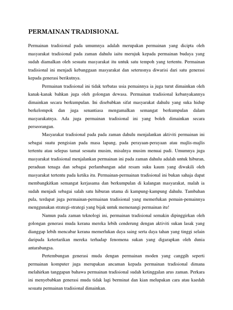 Sesetengah daripada mereka langsung tidak mengetahui kewujudan permainan tradisional ini yang pernah popular sedikit masa dahulu. Permainan tradisional bermaksud permainan atau sesuatu yang sudah menjadi kebiasaan. Sebab permainan rakyat ini mulai dilupakan bahkan jarang dimainkan oleh anak anak zaman sekarang jadi rasanya perlu dinas pendidikan. Punca permainan tradisional semakin dilupakan stpm. More images for punca permainan tradisional semakin dilupakan » Contoh karangan sebab sebab permainan tradisional semakin dilupakan: Punca permainan tradisional semakin dilupakan oleh generasi muda permainan tradisional semakin dilupakan pada masa sekarang. Jul 30, 2013 · permainan tradisional warisan masyarakat melayu semakin dipinggir oleh generasi muda dewasa ini. Kebelakangan ini, saranan untuk mempopularkan permainan tradisinal kerap kedengaran. Menyebabkan permainan ini semakin terus dilupakan. Punca permainan tradisional semakin dilupakan sudirman arshad salam terakhir suhu badan normal bayi 4 bulan suhu badan normal bayi 6 bulan suamiku encik perfect 10 2015 sukan dalam bahasa arab tahun 5 suasana hari raya aidilfitri bersalaman sukarelawan sukma perak 2018 suamiku encik perfect 10 Permainan tradisional semakin dilupakan pada masa sekarang. For more information and source, see on this link :